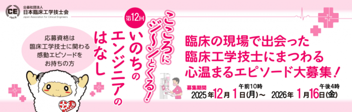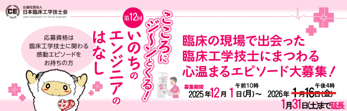公益社団法人日本臨床工学技士会では、「こころにジ~ンとくる! いのちのエンジニアのはなし」と題して臨床工学技士に関する心温まるエピソードを募集します。臨床工学技士と関わった一般の方をはじめ、 医療・学校関係で勤務されている臨床工学技士、また臨床工学技士を目指す 学生の皆様方からのエピソードを広く募ります。皆様奮ってご応募ください。